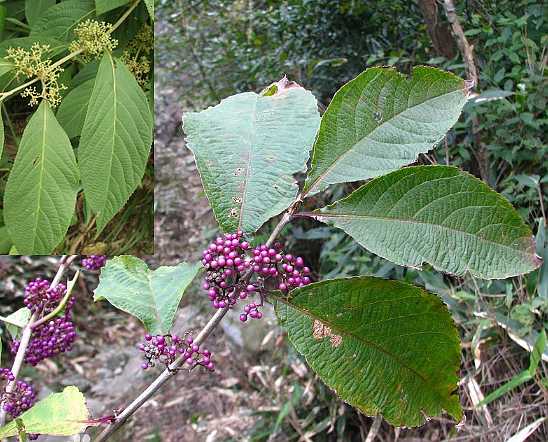 灌木,高达3米。小枝有粗糠状短柔毛或平滑无毛。叶对生;阔椭圆形以至椭圆状卵形或椭圆状披针形,长5~10厘米,先端渐尖,基部阔楔形,边缘为小齿牙或齿牙状,下面疏生星状毛及腺点;叶柄长0.5~1厘米。密生的聚伞花序,径2~3厘米;总梗有短柔毛,与叶柄等长或短于叶柄;花水红色;萼短钟状,截形;花冠短筒状,4裂;雄蕊4,长7毫米,花丝较花冠之裂片为长,花药广椭圆形;雌蕊1,子房4室。核果,堇紫色,径3~4毫米。花期7~9月。果期9~10月。5~10月采,鲜用或晒干。