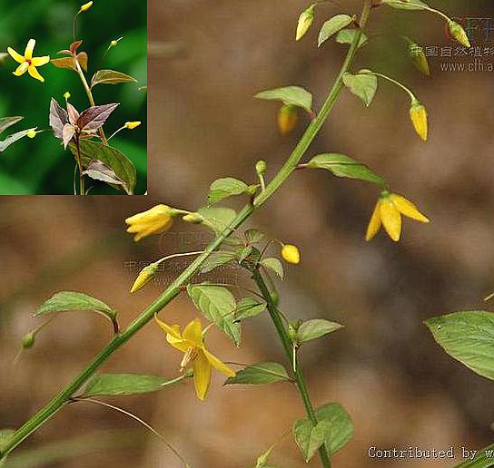 一年生草本,有香气。茎下部匍匐地面,节上生须根与分出直立的枝,高达50厘米;茎细长,呈四角或五角形,棱生狭翅,无毛。单叶互生;叶片卵形或卵状披针形,长3~6厘米,宽7~17毫米,先端渐尖,全缘,基部楔形,羽状脉每侧4~5条,淡绿色,纸质;叶柄长2~6毫米。花单生于叶腋,花梗甚细,长2~3厘米;花黄色,直径约1厘米;花萼长约3毫米,下部合生,5长齿裂,内面及边缘有红色腺点密生;花冠5深裂,长约6毫米;雄蕊5,与花冠裂片对生,着生花冠基部,花丝很短,长约1毫米,花粉囊长约4毫米;雌蕊1,子房1室,近球形,直径1毫米,花柱长约5毫米。蒴果球形,直径2毫米。种子多数,细小,多角形。花期6月。果熟期秋末。夏季开花时采收,晒干。