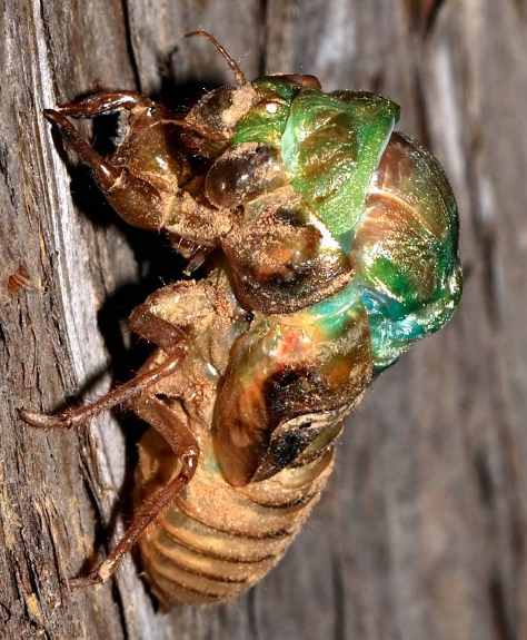 【药材】全形似蝉而中空,稍弯曲。长约3~4厘米,宽约1.5~2厘米。表面呈茶棕色,半透明,有光泽,被黑棕色或黄棕色细毛。头部触角1对,呈丝状,多已断落;复眼突出,透明;额部突出;上唇宽短,下唇延长成管状。胸的背面纵裂或呈十字形纵横裂开;左右具小翅两对,前对较长,后对较短;腹面足3对,前足腿节及胫节先端具锯齿,肘节先端有2个小刺,齿刺皆呈黑棕色;中足及后足均细长。腹部扁圆;共分9节,尾端呈三角状钝尖。体轻,膜质,中空,易碎。气微弱,味淡。以色黄、体轻、完整、无泥砂者为佳。夏、秋采集,除净泥土,晒干。