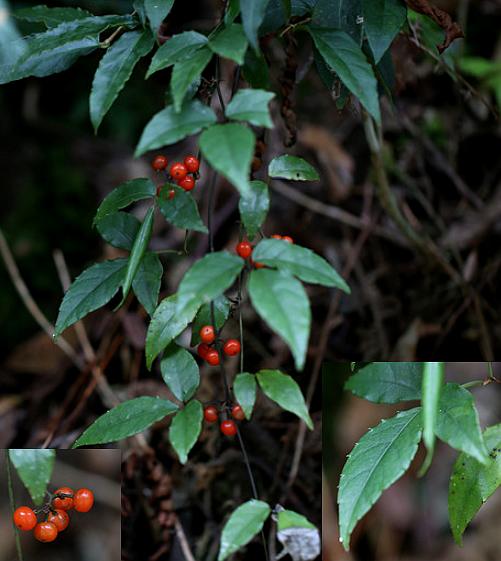 【备考】《植物名实图考》:“蛇附子,产建昌。蔓生,茎 如初生小竹,有节。一枝三叶,叶长有尖,圆齿疏纹。对叶 生须,须就地生,根大如麦冬。”“石猴子,产南安。蔓生细 茎,茎距根近处有粗节手指大,如麦门冬,黑褐色。节间有细须缭绕,短枝三叶,叶微似月季花叶。