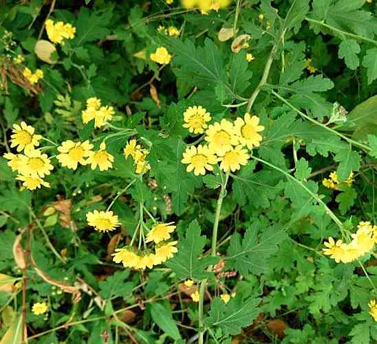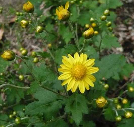 ③岩香菊:多年生草本,高达150厘米。茎直立,多叉状分枝,生有微毛,较北野菊为稀。叶较薄,长卵形,1~2回羽状深裂或掌状深裂,裂片长椭圆状卵形、披针形,有尖锯齿,下面微具柔毛;假托叶不显著。头状花序多数,直径8~12毫米,生于枝端,稍下垂,集成近聚伞状;总苞半球形,苞片3~4列;舌状花1列。长椭圆形,与中央的管状花全为黄色。