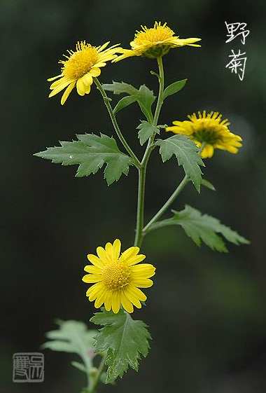 ②北野菊:多年生草本,高达150厘米。茎直立,粗壮,近叉状分枝。基生叶有时枯萎。叶互生,卵状长圆形或阔卵形,长3~7厘米,宽2.5~5厘米,先端尖,基部稍呈心形、截形或近圆形,羽状或近掌状5~7深裂,裂片狭卵形或长圆形,有缺刻状锐牙齿,下面灰白色,密被分叉状短柔毛及腺体;具叶柄。头状花序多数,直径8~12毫米,生于枝端,密集成聚伞状,有时近乎伞形;总苞浅杯状,苞片长卵形,覆瓦状排列,中肋绿色,革质,边缘膜质,褐色;舌状花管状花均为黄色,管状花疏生腺点。