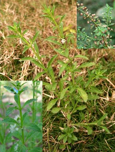 【原植物】亚灌木,高25~80厘米,全株无毛。根粗壮。茎直立,有分枝,下部木质化。叶小,对生及轮生,披针形至椭圆形或倒卵形,长5~20毫米,先端短尖,基部渐狭而成一短柄,边缘有锯齿。花小,多数,白色,单生或成对;萼片4,卵状矩圆形,长约2毫米;花冠辐状,4裂,裂片椭圆形,花径4~5毫米,喉部有毛;雄蕊4,花药箭头形,黄绿色;雌蕊1,花柱细长,柱头盘状。蒴果卵状至球形,直径2~3毫米,花柱宿存,熟后开裂。花期夏、秋间。全年可采,鲜用或晒干。