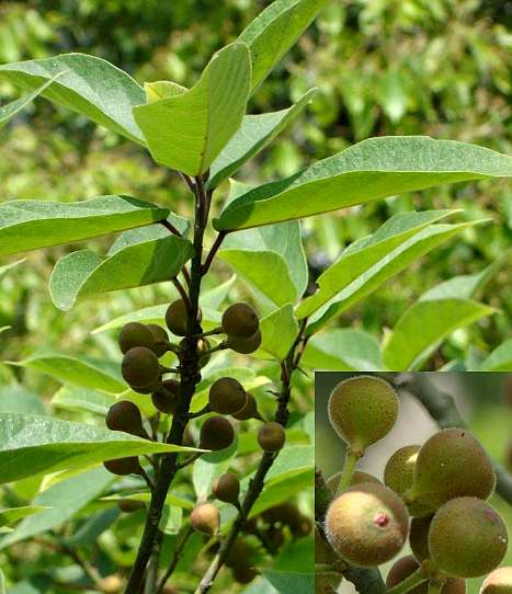 常绿乔木,高可达18米,直径40厘米;枝、芽、叶下面和花序都密生锈色绒毛。叶互生,革质,矩圆形、卵状矩圆形或倒卵形,长7.5~13厘米,宽2.2~4.5厘米,基部楔形,具羽状脉;叶柄长1~1.2厘米。圆锥花序生于小枝顶端,近于无总花梗;花黄绿色;花被片6,宿存,反曲,有锈色绒毛,内轮花被片卵形,外轮花被片小而狭;能育雄蕊9,第3轮雄蕊花丝基部有绒毛,腺体心形,着生在花丝基部以上;子房淡红色。果实球形,直径约4毫米,紫红色。夏、秋季采收。