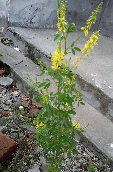 多年生草本,高30~70厘米。茎直立或匍匐,稍有毛,多分枝。三出复叶,小叶长圆状倒卵形,或倒披针形,长1~2厘米,宽2~4毫米,先端钝圆,基部楔形,边缘上部有齿;托叶大,尖而长。总状花序,腋生,有花10~20朵;花梗长于叶柄;花冠蝶形,黄色,比萼长2倍。荚果扁,矩形,弯曲成半月形,光滑,长1.5~2厘米,成熟时褐色。种子5~10粒。花期8月中旬。夏、秋采收,晒干。