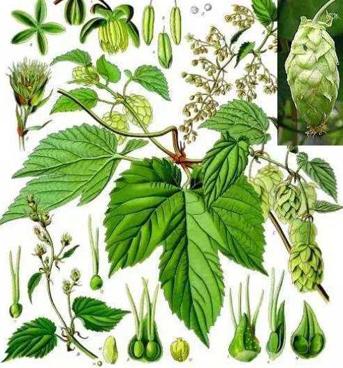 多年生草质藤本,高4~6米,具倒生刺毛。叶对生,轮廓卵圆状,3~5深裂,稀7裂,长5~13厘米,先端尖,基部心形,边缘有锯齿,具长柄,表面粗糙;生花序枝上的叶较小,不分裂。雌雄异株,雄花序圆锥状,大型;雌花序短穗状,卵圆形,稍下垂,具细长梗,淡黄绿色,结果时呈球形;苞片内面基部有芳香腺点,于花后增大。瘦果扁圆形,褐色。秋季花初开放时采摘,阴干或烘干。