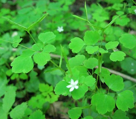 多年生草本,高15厘米左右。根须状。茎纤细,柔软。基生叶有长柄,三出复叶,中心叶片较大,梗较长,两侧的梗又分枝,有小叶2~5;茎上部分枝处有2个复叶,每复叶有小叶3~5;小叶片扇形,先端有圆缺刻,基部楔形,全缘。花白色,单生于纤细的花梗上。??果2,人字开展,有种子数枚。夏,秋采收。