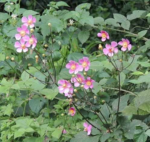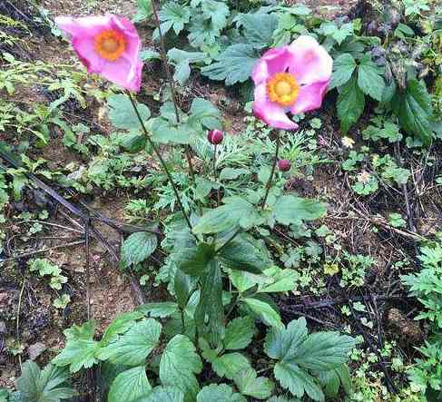 多年生草本,高达60厘米。茎、叶柄、花柄均带白色,上生多数刚毛。茎直立,叉状分枝。基生叶簇生,有长柄;叶片圆或略呈不整五角形,4~5裂,边缘再浅分裂,并具圆齿,叶基部心脏形或耳形,上面绿色,有稀毛,下面灰白色,沿脉布毛较密,主脉掌状;茎生叶对生,叶柄短,叶片较基生叶小。花单生于花枝分叉处,枝顶的花常2~4朵簇生;花柄下有叶状苞,苞叶形同茎生叶,但较小;花柄细长,花芽下垂,开时直立;花被5,白色或淡红色,外面密生丝状白毛,内面无毛;雄蕊多数;雌蕊圆锥形或卵形,除柱头外,遍生白细毛,柱头长方形,倾斜,无毛。瘦果多数,集成球状,密生白毛。花期5~6月。