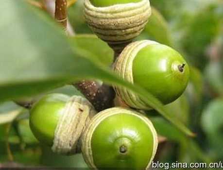 常绿乔木,高5~20米。小枝有褐色茸毛。叶互生,革质,椭圆状披针形或矩椭圆形,长6~10厘米,宽1.5~3厘米,先端渐尖或短尾尖,基部楔形,全缘,上面绿色亮,下面密生灰褐色茸毛,叶脉于下面明显凸出,侧脉9~12对;叶柄长8~20毫米,密生褐色茸毛。直立的?荑花序,长达24厘米;花单性,雌雄同株;雄花3朵聚生;雌花数十朵,细小,3~7簇生。果序长10~20厘米,果密集;小坚果扁球形,直径1~1.6厘米,长0.9~1.5厘米,果实的3/4为壳斗包被,壳斗木质,上排为覆瓦状的鳞片,被有棕黄色细毛,苞片三角形和壳斗贴生,顶端和壳斗分离;花柱宿存。花期春季。4~5月采收。