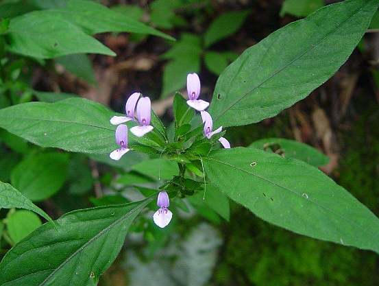 多年生草本,高达80厘米,有灰白色毛。茎有浅槽,节间长。叶对生,卵形,长3~10厘米,宽1.4~4厘米,先端渐尖,基部楔形,全缘。花单生,淡红色;苞片2,椭圆形;萼5裂,裂片披针形;花冠筒细长,长约为裂片的2倍以上,裂片2唇状,上唇近于全缘,下唇3浅裂;雄蕊2,着生于花冠筒内,花丝有毛,药2室,丝形,1室在下;花柱丝状,柱头2裂。蒴果椭圆形,有毛;种子4粒,黑色,卵圆形而扁,表面有凸起小点。花期8~10月。夏、秋幸采,鲜用或晒干。