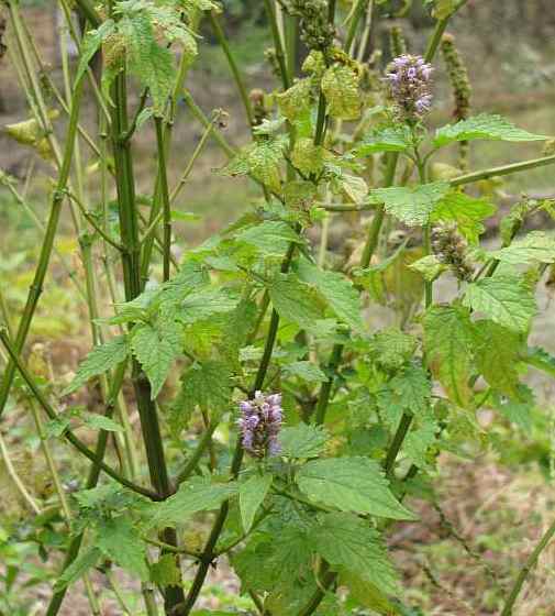 草本,高1~1.5米,全株有香气。茎四方形,被短柔毛。叶对生,卵形或阔卵形,边缘有粗锯齿,基部阔楔形,下延至叶柄而成狭翅,两面被疏柔毛。聚伞花序腋生或顶生;萼钟形,萼齿5,近相等而后齿稍大;花二唇形,上唇盔状,褐色或紫色,下唇黄色,平展,先端3裂:雄蕊4。小坚果卵形,腹面具棱,背圆,褐色。花期10~12月。夏、秋采收,晒干。