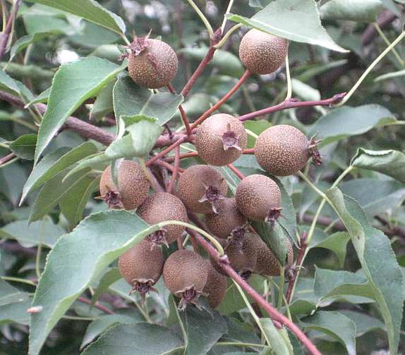 落叶乔木或灌木,高可达9米。树皮灰黑色;小枝光滑;冬芽有细毛。单叶互生,或于短枝上簇生,阔卵形或卵形,长4~8厘米,宽3.3~5.5厘米,先端短锐尖,基部圆形至阔楔形,边缘有细而圆钝的锯齿,两面无毛;叶柄长2~4厘米。伞房花序呈总状,有花6~12朵,花径2~2.5厘米;花梗长1.5~3厘米;萼片5,披针形,稍短于萼筒),外面无毛,内面有稀毛;花瓣5,卵圆形,白色有短爪;雄蕊20;花柱2,稀为3。梨果球形,径约1~2厘米,黑褐色,有斑点,萼裂片脱落;果柄细长。种子黑褐色。花期4月。果期9月。