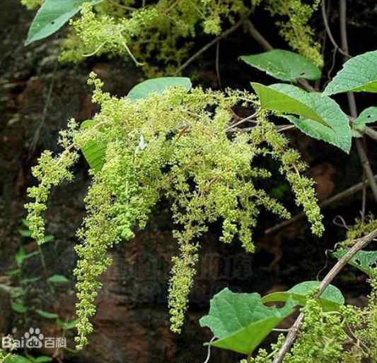 木质藤本;幼枝近圆柱形,有白色蛛丝状柔毛,后变无毛。叶心形或心状卵形,长8~15厘米,宽5~10厘米,通常不裂,有时不明显3浅裂,边缘有小牙齿,下面沿脉有锈色蛛丝状毛,叶脉下面隆起,脉网显明,两面常有白粉;叶柄长4~7厘米。圆锥花序长8~15厘米;花小,淡绿色;花萼盘形,全缘;花瓣5;雄蕊5。浆果球形,直径7~12(~18)毫米,蓝黑色,有白粉。