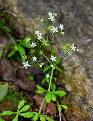 一年生草本,全体无毛,具须根。茎单生或丛生,高5~30厘米。叶3~5片轮生,长圆状匙形,长8~20毫米,宽2~4毫米,先端急尖,基部渐狭,全缘,无柄或几无柄。花序圆锥状或伞房状,分枝长,下部叶腋也生有花序;花稀疏;花梗长5~8毫米,细弱;萼片5,狭三角形至卵状披针形;花瓣5,白色,矩圆状卵形;雄蕊10;鳞片宽匙形,顶端有深缺刻;心皮5,近直立,下部合生,有小乳头状突起。??成熟时上半部斜展;种子少数,微小。春、夏采挖带根全草,洗净,阴干或鲜用。