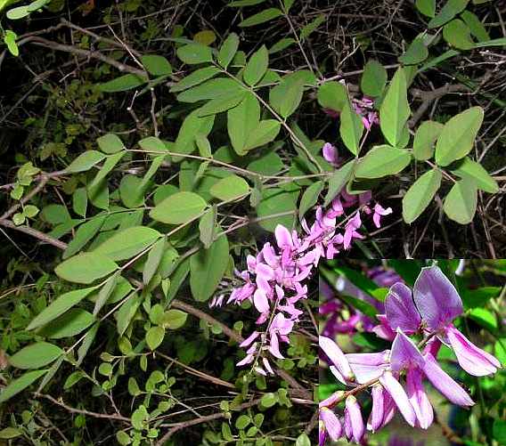 直立灌木或亚灌木,高30~90厘米,近秃净。单数羽状复叶,互生;小叶7~13枚,对生,叶片卵形至卵状披针形,长2.5~6厘米,宽1~2.5厘米;上面绿色,无毛,下面有白色丁字毛;先端短尖,基部狭,全缘;托叶针状。总状花序腋生,长至15厘米;花柄纤弱;萼杯状,5齿裂,萼齿宽三角形,有白色疏柔毛;花冠蝶形,淡红色,长约15毫米,旗瓣密被短毛。荚果直,线形,长约4厘米,棕黑色。种子多数。花期夏季。全年可采。洗净晒干。