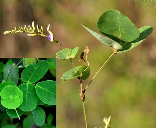 攀援灌木。茎细弱,被白色长柔毛。小叶3,二型,茎中下部的叶有长2~6厘米的叶柄,小叶宽椭圆形或倒卵形,长4~6厘米,宽3~5厘米,先端钝,基部圆形,无毛;茎上部叶的小叶无柄,心脏形或近圆形,抱茎,较小;托叶卵状披针形,基部心脏形,具纵肋,小托叶披针形。总状花序腋生,花多而密;苞片披针形;萼钟状,萼齿三角形;花冠紫色;子房无柄,无毛。荚果扁,条形,黄色,长5厘米左右。种子多数,褐色,肾形。全年可采。切段晒干。