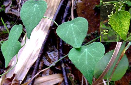 缠绕草质藤本,根似鸡肠,褐黑色。茎纤细有纵条纹,嫩枝被毛。叶盾状着生,三角状阔卵形,长4~10厘米,宽2.5~8厘米,先端渐尖,基部微缺或近截平,通常全缘,两面被柔毛,缘毛甚密,长而扩展,掌状脉9~10条;叶柄长1~4厘米,被倒向长柔毛。雄花序直立,系密伞花序复作圆锥花序式排列,腋生,具1~2回分枝,被长柔毛,雄花萼筒杯状,下面被长硬毛,萼檐4裂,裂片阔三角形;花冠筒浅杯状;聚药雄蕊稍伸出;雌花序下垂,系密伞花序复作总状花序式排列,雌花萼片2,近圆形,下面密被硬毛;花瓣2,横长圆形,无毛;子房密被硬毛,柱头裂片尖锐。核果初被硬毛,成熟时近无毛,骨质的内果皮背部两侧各有2行疣状小突起。花果期秋冬。全年可采。