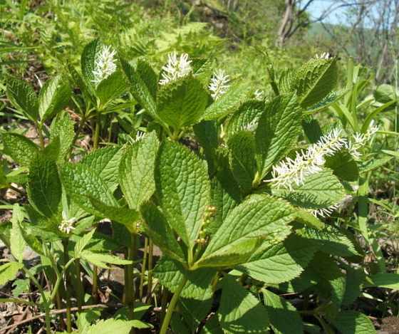 多年生草本。茎直立,通常不分枝,无毛,高约30~40厘米,节明显,带紫色,上生鳞片状小叶数对。茎顶4叶对生,广卵形、卵形或椭圆形,长4~12厘米,宽2~6厘米,先端长尖,基部楔形,边缘具粗锯齿,齿尖有一腺体,叶面暗绿色,背面淡绿色,纸质;叶柄长约10~15毫米.穗状花序顶生,单条,长约2~3厘米,下有2~5厘米的柄,对生多数小花,花两性;苞片白色,无柄与花被;雄蕊3,花丝线形,白色,长4~5毫米,基部愈合,着生手子房背面,上部分离,中间的雄蕊无花药;子房下位,绿色,柱头子截无柄,核果梨形,径约2毫米。花期春季。
