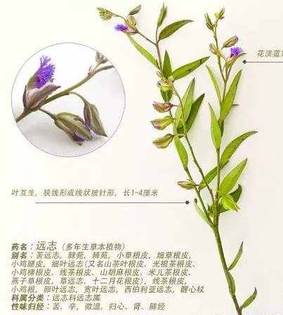 《植物名实图考》: “甜远志,生云南大华山。独根独茎,长叶疏齿,马志所谓似大青而小者,盖即此。根如蒿根,色黄,长及一尺,皆与《图经》说符。李时珍分大叶、小叶;<滇本草》分苦、甜。苦即小叶,甜即大叶耳。补心血,定惊悸,主治略同。但<本经》只言味苦; <滇本草》苦远志治证,悉如古方,甜者仅云同鸡煮食。盖苦能降,甜惟滋补耳。《救荒本草》图亦是小叶者,夷门所产,自是小草。”