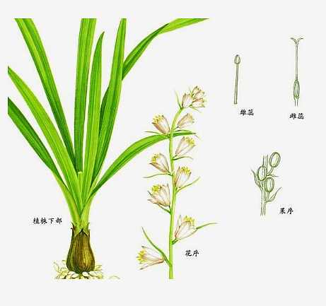 多年生草木,高60~150厘米。鳞茎狭窄,卵形,无鳞片,具淡褐色的膜被;须根多数,根上长小鳞茎多个,卵形,两头尖。基生叶5~10片,无柄,带形,长约30厘米,宽约1.5厘米,先端渐尖,全缘,绿色,叶脉带紫色;花茎上叶较小,互生,线形或线状披针形。总状花序顶生,有花10~20余朵;花紫蓝色;花被6片,长2.5~3厘米;雄蕊6,花药背着于花丝之顶。蒴果倒卵状长圆形,有钝棱,顶端有脐。8~9月采挖。