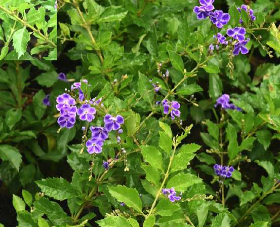 直立常绿灌木,高2~3米。枝无刺或有刺,常下垂或卧地。叶对生或轮生,椭圆形或倒卵形,长3~6厘米,先端短尖或浑圆,基部楔尖,边缘在中部以上有锯齿。总状花序腋生,排成一顶生的圆锥花序,柔弱而扩展;长约10厘米,花常生于中轴的一边;萼管状,5裂,裂齿尖而小;花冠5裂,裂片不等,紫蓝色或白色,径约1厘米;雄蕊4,内藏,花丝短,着生于冠管的中部;于房8室,每室有胚珠1颗。肉质核果卵形,黄色,为扩大的萼所包围。花期全年。全年可采。