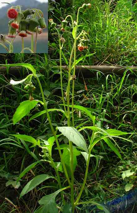 一年生直立草本,高可达1米。茎圆形,有纵条纹。单叶互生;具长柄;叶片矩圆状椭圆形,长7~12厘米,先端短尖或钝,基部渐狭,边缘有不规则的齿缺或浅裂,两面近秃净。头状花序少数,腋生及顶生,排列成狭圆锥花序;总苞绿色,圆柱形,长约1厘米,苞片约20余枚,线状披针形,边缘膜质,顶端有小束毛;花粉红色,全部为管状花。瘦果狭圆柱形,赤红色,有线条,被小毛;冠毛白色,丰富。花期夏季前后。夏季采收。一般以鲜用为佳。