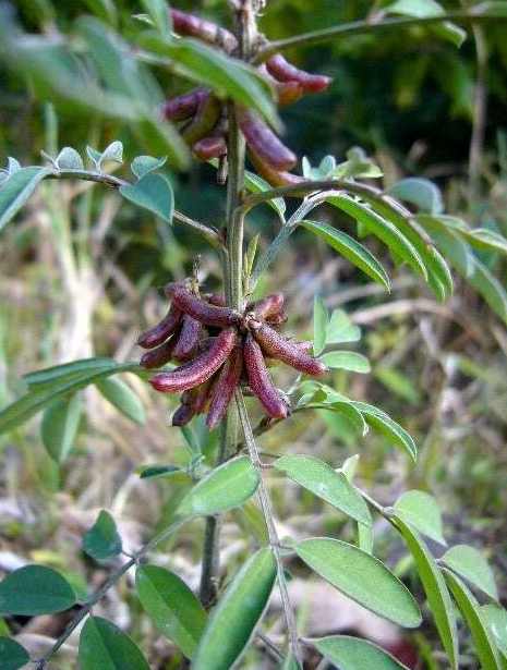 直立灌木或亚灌木,高1~1.5米。茎有角,稍分枝,被紧贴短柔毛。羽状复叶,长5~10厘米,有小叶7~15枚,小叶对生,矩圆形,倒披针形或倒卵形,长1~2.5厘米。先端矩锐尖,上面近秃净或略被疏毛,下面灰白色而被紧贴的柔毛;托叶锥尖。总状花序腋生,长2~3厘米;花柄极短而下弯;萼钟形,被紧贴的柔毛,5齿裂,齿闰而短,约与萼管等长:花冠蝶形,红色,长约5毫米;雄蕊10,2束;花柱短,柱头头状。荚果圆柱形,下垂,弯曲如镰状,棕红色,长1~1.5厘米,被短柔毛,有种子6~8颗。花期春季。7~8月采收。