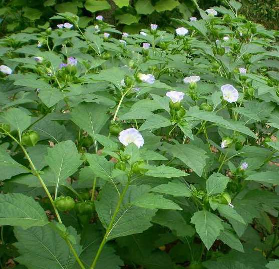 一年生草本,高50~80厘米。主根长锥形,有纤细的须根。茎棱状圆柱形,有4~5条纵沟,绿色,有时带紫色,上部三叉状分枝。单叶互生,草质,连叶柄长4~15厘米,宽1.5~7.5厘米,先端渐尖,基部阔楔形下延,边缘有不规则的锯齿且成皱波状,侧脉4~5对,上面凹陷,下面凸起。花单生于叶腋,淡紫色;花萼5深裂,裂片基部心形;花冠漏斗状,径约3厘米,花筒内面基部有5个紫斑。蒴果球形,径约2厘米,外包5个宿存萼片。种子小,淡褐色。花期夏季。秋季采收。