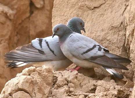③岩鸽:雌雄体色相似,很象普通驯养的鸽子,但有两道白色横斑,一在腰部,另一在近尾端处。幼鸟体色较深,胸部金属闪光较少。分布我国北部。