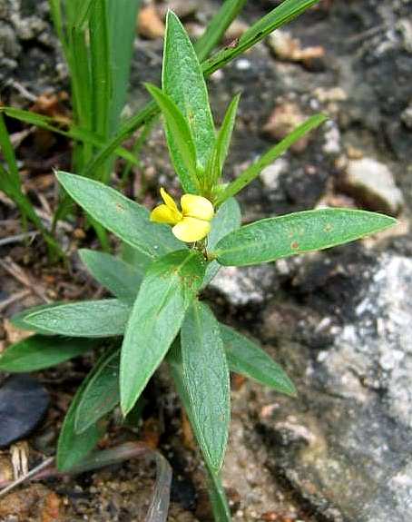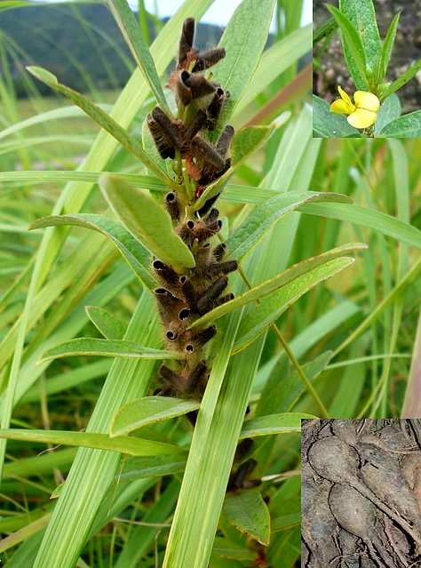 多年生直立草本,高15~50厘米。块根纺锤形。茎柔弱,被稀疏棕色长柔毛与灰白色短柔毛。单叶互生,近无柄;叶片长圆状披针形至线形,长2.5~6厘米,宽0.5~1.2厘米,先端急尖,基部近圆形或心形;上面绿色,有散生疏长毛,下面粉绿色,有灰白色星状茸毛,中脉有锈色疏长毛;托叶线形,长2~6毫米。总状花序腋生,花序柄长4~10毫米,有花1~2朵;苞片线状披针形;萼钟状,外被棕黄色长柔毛与灰白色短柔毛,萼齿5枚,近等长;花冠淡黄色,长6~7毫米,旗瓣卵形,上部有短毛,基部有两耳与短爪,翼瓣与龙骨瓣在外面沿顶端处亦稍有毛:雄蕊10,2体;雌蕊1,子房密被白色长硬毛,无柄,胚珠2;花柱线形,柱头头状。荚果长圆形,膨胀,长8~10毫米,宽约6毫米,顶端有细尖,外被棕黄色长柔毛与灰白色短柔毛;种子2粒,紫黑色,肾形。花期5月。果期7月。初春或秋末挖取,洗净泥沙,切片晒干。