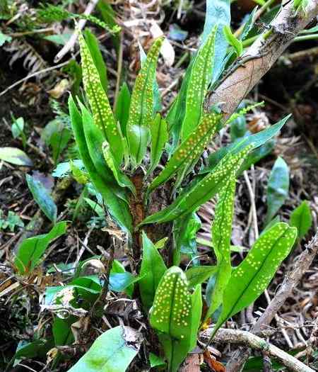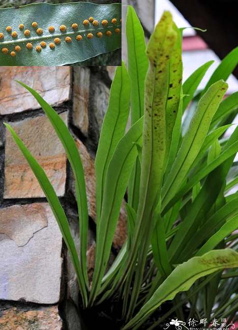 多年生附生草本,高50~70厘米。根茎横生,细弱,疏被鳞片;鳞片阔卵形,急尖,淡棕色,早脱落。叶近生,柄长3~15厘米;叶片狭线状披针形至阔线状披针形,长30~45厘米,宽1.5~5厘米,两端狭尖,全缘,近革质,淡绿色,叶脉不明显。孢子囊群大,棕黄色,排列成1行或为不整齐的2行,较近中肋,无盖,也不具隔丝。全年可采。