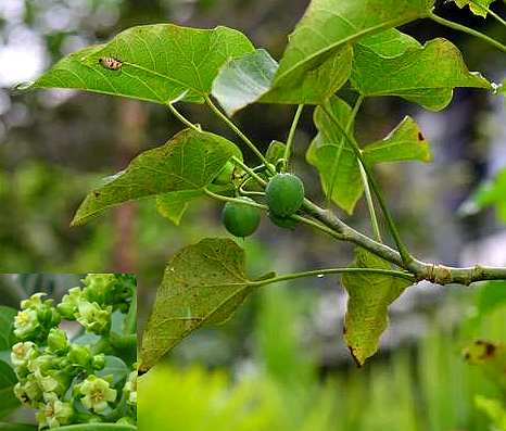 灌木或小乔木,高2~5米,全株有灰白色乳汁。树皮光滑,苍白色。枝具凸起的叶痕。叶互生,近圆形,长7~16厘米,全缘或3~5裂,基都心形,掌状叶脉5~7条,幼时脉上被毛;叶柄长6~18厘米。花单性,雌雄同株,聚伞花序,腋生,长6~10厘米;总花梗长,中部以上具分枝;苞片线状披针形或披针形;雄花萼片及花瓣各5枚,花瓣长圆形,淡绿色,里面被绒毛;雄蕊10,两轮,内轮花丝合生;花盘腺体5;雌花无花瓣;子房卵圆形,无毛,3室,花柱3。柱头裂。蒴果近球形,径约2.5厘米,黄色,熟时裂成3个2瓣裂的分果爿。种子长圆形,黑色,平滑。花期4~5月。随时可采。