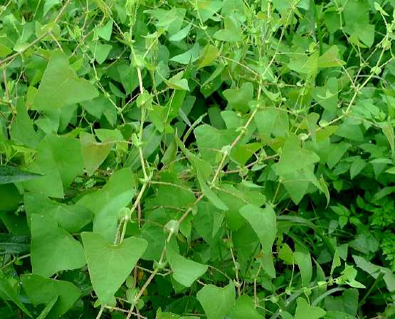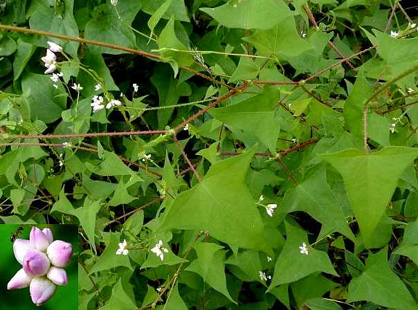 多年生草本。茎蔓延或上升,长达1~3米,四棱形,有倒生钩刺。叶有长柄;叶片三角形或三角状赣形,长4~8厘米,宽3~7厘米,先端渐尖或狭尖,基部心形,通常两面无毛或生稀疏细毛,下面沿叶脉有倒生钩刺;托叶鞘短筒状,膜质,上部草质,绿色。头状花序顶生或腋生;总花梗生腺毛和短柔毛,疏生钩刺;花淡红色;花被5深裂,裂片矩圆形;雄蕊8;花柱3,下部合生,柱头头状。瘦果近球形,黑色,光亮。夏、秋采收。