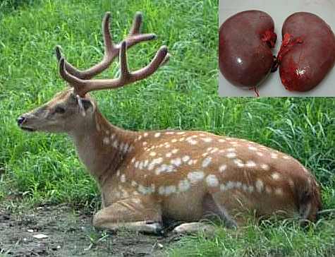 【炮制】鹿肾片:将鹿肾洗净,温水浸润,切片,晒干或烘干。鹿肾粉:将鹿肾片入炒热的砂子中,并同炒至松泡,取出碾粉。