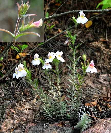 二年生草本,高15~30厘米,全体具银白色密绒毛。茎丛生,细而硬。叶稠密,对生或3枚轮生,有时互生;叶片狭披针形,长1~3厘米,阔1~2毫米,全缘,先端渐锐尖,基部狭窄无柄。花序具腺毛,苞片呈叶状,花单生于苞腋;花萼的筒部几与裂片等长,具10棱,裂片线形;花冠唇形,长2~2.5厘米,长过于花萼,淡红色,喉部稍膨大,上唇盔状弯曲,2裂,下唇长于上唇,中裂片较长,喉部有2沟;雄蕊4,2强,外露;子房具不完全2室,中轴胎室,胚珠多数。蒴果包藏于萼内,长圆形,先端尖锐,具4条纵沟,成熟时沿一侧面裂开。种子多数,扁平。花期4~5月。