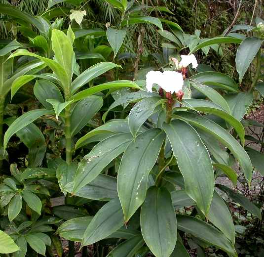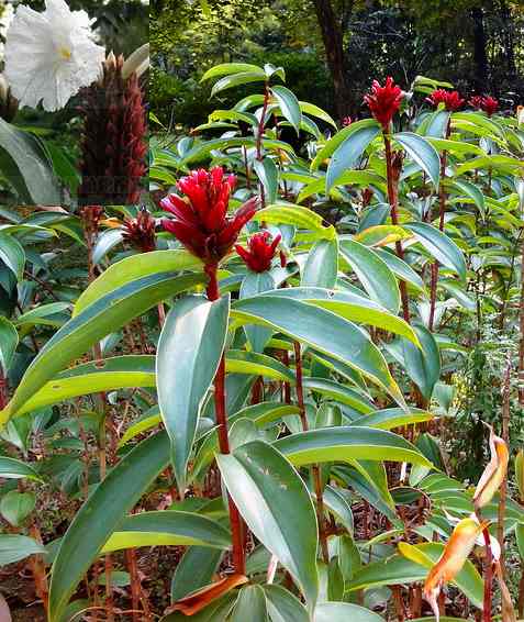 高大草本,高1.5~2.5米。根茎块状,横生,茎基部近木质,通常上部分枝。单叶,螺旋状排列,长圆形至披针形,长15~20厘米,宽6~7厘米,先端渐尖或尾尖,基部圆,全缘,直立平行的羽状脉由中央斜出,下面密被绢毛;叶鞘阔而封闭。穗状花序,无柄;苞片覆瓦状排列,卵形,红色,长约2厘米,具增厚而略锐利的刺状渐尖,每1苞片内有花1朵,其侧有1小苞片,长1.2~1.5厘米;花萼管状,长1.8~2厘米,红色,先端3裂;花冠管短而大,裂片椭圆形或卵形,长2.5厘米,白色或带红色,唇瓣卵形,白色,中部橙黄色,长宽约4~8厘米,先端具裂片及皱状波;雄蕊1,花瓣状,药室线形,长约9毫米,平行;子房2~3室,胚珠多数。蒴果球形,稍木质,长1.3厘米,红色。种子黑色,光亮,长约3毫米。花期秋季。果期冬季。全年可采,但以秋季为佳。根茎挖出后,去净须根、茎叶、泥沙,晒干或切片晒干。