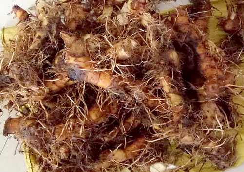 【药材】干燥根茎多切成片状,长约2~6厘米,宽1.5~2厘米,厚约2毫米。栓皮薄而平滑,灰黄色或灰褐色,有疏的轮节,并有残存细根及根痕。断面灰白色,散列众多的纤维及维管束,纤维非木化或弱木化,质软不剌手,薄壁细胞含有姜科特有的淀粉粒。气微,味淡微苦。以片薄、色灰白、无黑色者为佳。
