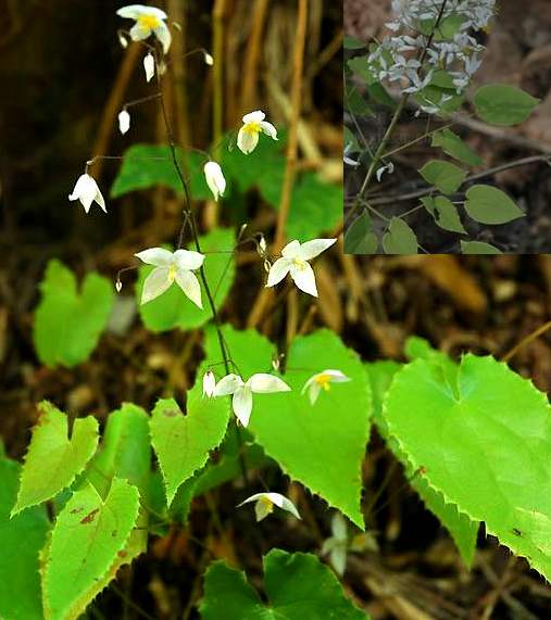②心叶淫羊藿:多年生草本,高30~40厘米。形与上种相似,但小叶片卵圆形或近圆形,长2.5~5厘米,宽2~4厘米,先端宽阔锐尖,边缘具锯齿,基部深心形,侧生小叶不对称,外侧有小尖头。花成聚伞状圆锥花序,花梗有腺毛;花通常白色。花期6~7月。果期8月。