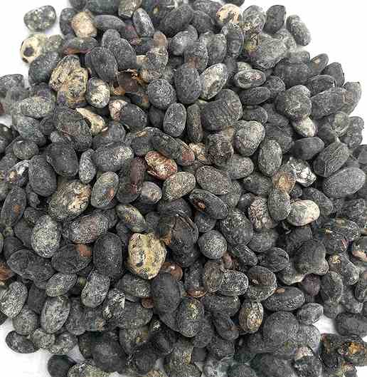 【药材】干燥品呈椭圆形,略扁,长0.5~1厘米,宽3~6毫米。外皮黑色,微有纵横不整的皱折,上有黄灰色膜状物。外皮多松泡,有的已脱落,露出棕色种仁。质脆,易破碎,断面色较浅。有霉臭,昧甘。以色黑、附有膜状物者为佳。