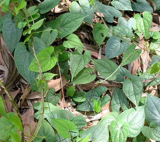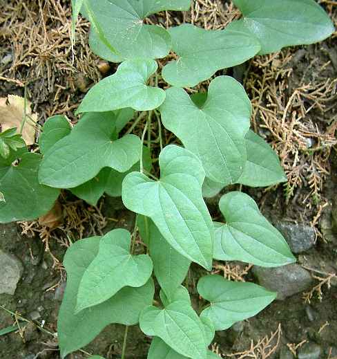 多年生缠绕草本。块根肥大,富含淀粉。茎圆柱形,稍扭曲,表面被微毛茸,节处较多。叶互生,心形,较厚,先端尖,略尾状,基部阔心形,全缘,上面近光滑,下面稍被毛,以叶脉及柄上为多;叶柄长约3.3厘米。花数朵排成腋生的穗状花序,基部有鞘状苞片2枚,长约1.5毫米,先端钻形;花单性异株,花被6裂。蒴果矩圆形,长15~22毫米,有3翼,边缘浅波状,两端微凹。种子狭卵形。花期夏季。秋、冬采收块根,洗净晒干。