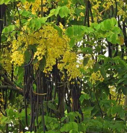 乔木,高可达15米,全株无毛。树皮灰白色,平滑。双数羽状复叶,对生;叶柄及叶轴无腺点;小叶4~8对,卵形至椭圆形,长6~15厘米,宽3.5~5厘米,先端渐尖,基部短尖,全缘,两面均被微毛。花腋生,总状花序疏散,悬垂;萼片5,长卵形,薄,长1~1.5厘米;花冠蝶形,花瓣5,鲜黄色,直径约4厘米,瓣片卵圆形,大小几相等;雄蕊10,不等长,且不完全发育,花丝弯曲,药椭圆形;雌蕊1,子房几无柄,花柱内弯,柱头顶生,截形。荚果圆柱形,暗褐色,长30~60厘米。种子扁平,赤褐色,光亮,种子间有隔膜。花期6月。9月间果实成熟时采收,晒干。