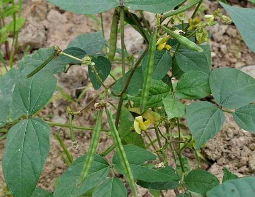 一年生直立或末端微缠绕草本,被淡褐色长硬毛。小叶3,阔卵形至棱状卵形,侧生小叶偏斜,长4~10厘米,宽2.5~7.5厘米,先瑞渐尖,基部圆形、楔形或截形,两面疏被长硬毛;托叶阔卵形;小托叶线形。总状花序腋生;苞片卵形或卵状长椭圆形,有长硬毛;花绿黄色;萼斜钟状,萼齿4,最下面1齿最长;旗瓣肾形,翼瓣有渐狭的爪,龙骨瓣的爪截形,其中1片龙骨瓣有角;雄蕊10,2束;子房无柄,密被长硬毛。荚果圆柱状,成熟时黑色,长6~10匣米,宽约6.5毫米,被稀长硬毛。种子短矩形,绿色或暗绿色。花期6~7月。果期8月。立秋后种子成熟时采收,拔取全株,晒干,将种子打落,簸净杂质。