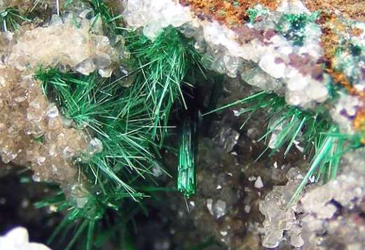 斜方晶系。晶体柱状或板状,晶面具垂直条纹。又为纤维状、粒状、肾状、致密状之集合体。颜色有美绿色、翠绿色或黑绿色。条痕为苹果绿色。光泽金刚石状或玻璃状。透明至半透明。解理依轴面而完全。断口贝壳状。硬度3~3.5。比重3.75~3.77。性脆。以火烧之,火焰现天蓝色,置闭口管中加热则生水。酸类能溶解之成绿色溶液。产于铜矿氧化带中。