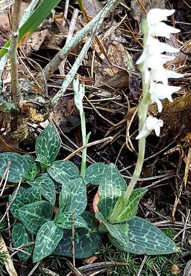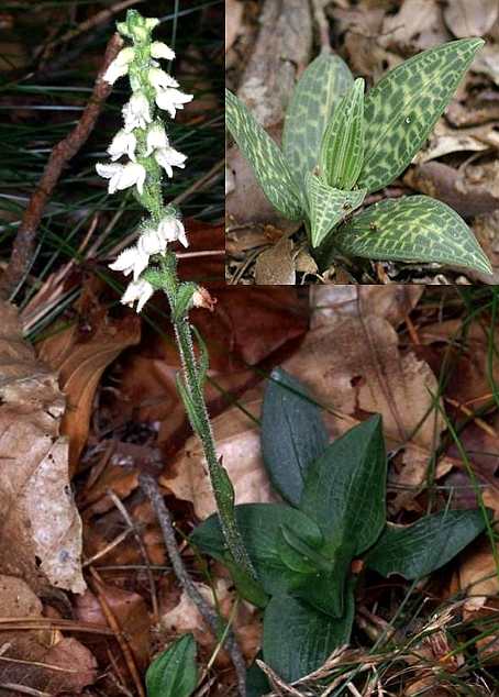 ②小斑叶兰:多年生草本,比前种较小。茎高10~20厘米。叶3~7枚互生于茎下部,卵形、卵状椭圆形,长1~2.5厘米,宽7~18毫米,先端锐尖或稍钝,基部圆乃至宽楔形。花梗具1~3枚鞘状鳞片;总状花序顶生,有毛;花白色或黄白色;萼片三角状卵形,长约4~5毫米;花瓣倒披针形,唇瓣与萼片等长,先端长喙狭而弯曲。