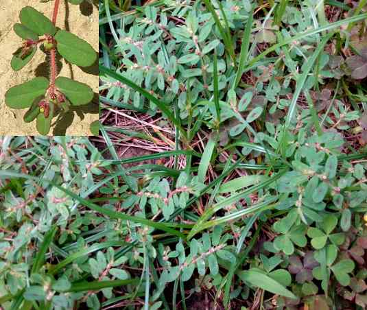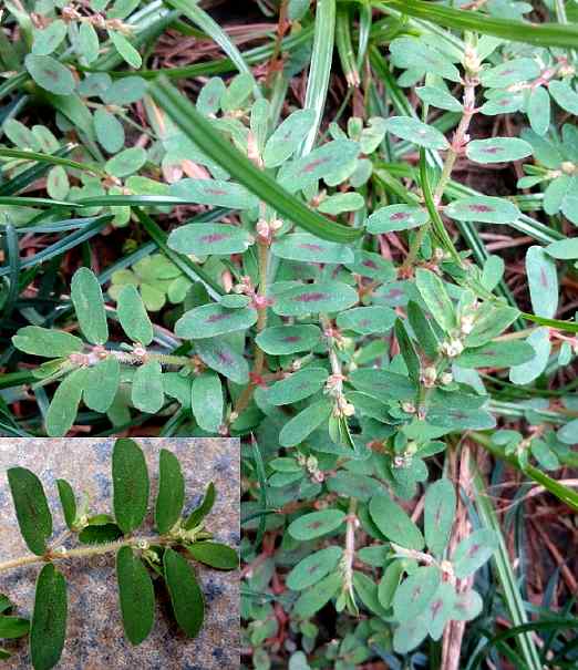一年生匍匐小草本,高15~25厘米,含白色乳汁。根纤细;分枝较密,枝柔细,带淡紫色,表面有白色细柔毛。叶小,对生,成2列,长椭圆形,长5~8毫米,宽2~3毫米,先端具短尖头,基部偏斜,边缘中部以上疏生细齿,上面暗绿色,中央具暗紫色斑纹,下面被白色短柔毛;叶柄长仅1毫米或几无柄;托叶线形,通常3深裂,杯状聚伞花序,单生于枝腋和叶腋,呈暗红色;总苞钟状,4裂;具腺体4枚,腺体横椭圆形,并有花瓣状附属物;总苞中包含由1枚雄蕊所成的雄花数朵,中间有雌花1朵,具小苞片,花柱3,子房有柄,悬垂于总苞外。蒴果三棱状卵球形,径约2毫米,表面被白色短柔毛,顶端残存花柱。种子卵形,具角棱,光滑。花期5~6月。果期8~9月。6~9月采收,晒干。