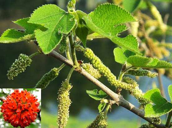 落叶乔木,高达10米。茎、叶具乳液;嫩枝被柔毛,后脱落,叶互生;叶片卵形,长8~18厘米,宽6~12厘米,不分裂或3~5深裂,先端尖,基部圆形或心脏形,有时不对称,边缘锯齿状,上面暗绿色,具粗糙伏毛,下面灰绿色,密生柔毛;叶柄长3~10厘米,具长柔毛;托叶膜质,早落。花单性,雌雄异株;雄花为腋生?荑花序,下垂,长约5厘米,萼4裂,雄蕊4;雌花为球形头状花序,有多数棒状苞片,先端圆锥形,有毛,雌蕊散生于苞片间,花柱细长,丝状,紫色,子房筒状,为花萼所包被,呈扁圆形。聚花果肉质,成球形,直径约2厘米,橙红色。花期5月。果期9月。8~10月间当果实成熟呈红色时打下,晒干,除去杂质。