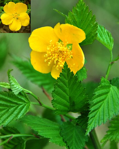 落叶灌木,高达1.5~2米。小枝绿色.老时平滑无毛。叶互生,椭圆状卵形,长2~5厘米,先端锐尖,基部截形或微心形,边缘有重锯齿或有浅裂,上面无毛,下面苍白色,沿脉间疏生短柔毛;叶柄长5~10毫米;托叶钻状,早落。花生于侧枝顶端,黄色;萼片5,裂片卵形,突尖头,筒部短广;花瓣金黄色,5片,广椭圆形,钝头;花盘环状,位于萼筒内;雄蕊多数,花丝线状,长为花瓣之半;雌蕊5枚,花柱丝状,与雄蕊等长。瘦果,棕黑色。花期4~5月。4~5月采花;7~8月采枝叶。