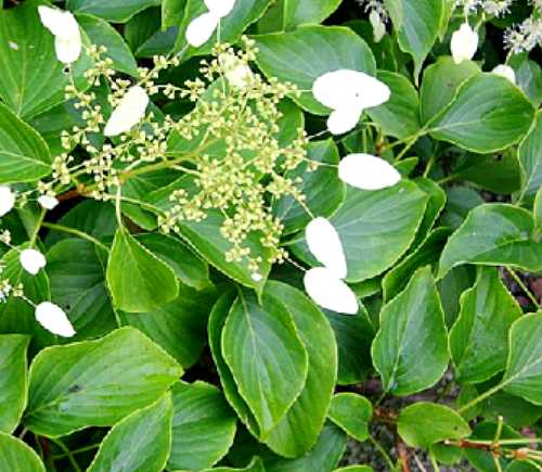 落叶攀援灌木。单叶对生,纸质,矩状卵圆形至长椭圆形,长8~15厘米,宽4~7厘米,先端阔渐尖,基部圆形或阔楔形,全缘,上面深绿色,下面有白霜,密生乳状突起,除脉腋有束毛外均秃净;叶柄长2~7厘米。伞房花序顶生;花2型;边缘不育花仅一大形萼片,呈矩圆形或狭矩圆形,长3~4厘米,先端钝,乳白色,老时棕色;孕性花小,萼片4~5,花瓣4~5,雄蕊10,花柱1。蒴果顶端圆锥状,有10肋。种子多数,线形。