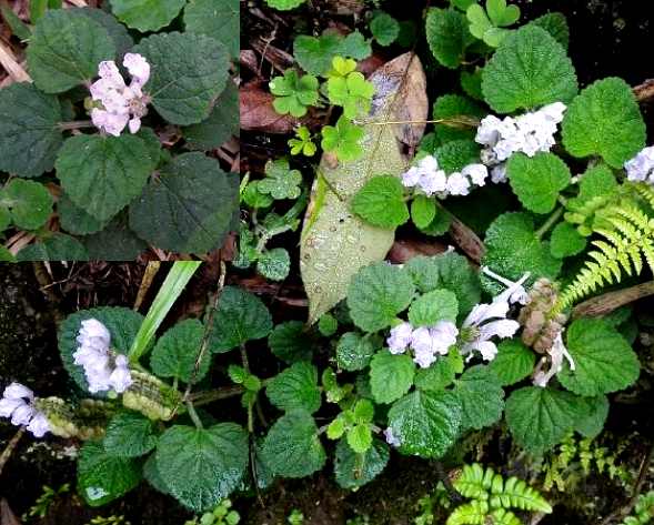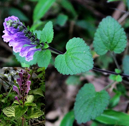 多年生草本,全体被毛,高10~37厘米。茎四方形,直立,基部倾卧,有分枝。叶对生,圆形、卵圆形或肾形,长8~29毫米,宽10~28毫米,先端钝圆,基部心脏形,边缘有圆锯齿,两面密生细毛;叶柄长5~15毫米。花轮有花2朵,集成偏侧的顶生总状花序;苞片卵圆形,两面都有短柔毛;小梗基部有1对刚毛状小苞片;花萼钟状,长2毫米,外面被粘柔毛,具2唇,全缘,萼筒背上生1囊状盾片;花冠紫色,2唇形,长约19毫米,外面被有腺体和短柔毛,上唇先端微凹,下唇有3裂片;雄蕊2对,不伸出,药室靠合;花柱着生子房底,先端2裂,小坚果横生,卵圆形,有小瘤状突起。花期4~5月。果期6~9月。