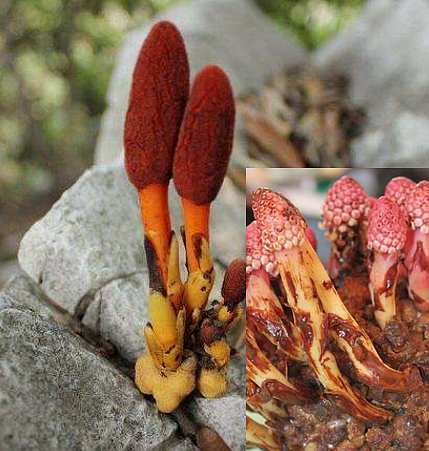 一年或多年生寄生内质草本,高10~15厘米。茎为块状球形,粗厚肥大,不规则分裂,淡黄褐色,具淡白色星状小突起;花茎粗壮而直立,红色,由块茎顶端抽出,高8~12厘米,径1~1.5厘米。叶螺旋互生,着生于花茎上,退化,呈鳞片状,卵形、阔卵形或狭卵形,橙黄色。花单性,雌雄异株,为顶生内穗状花序;花小形,无数,深红色,密集于序轴表面;雄花的花被4~6瓣,深裂,雄蕊4~6。花丝连合为单体;雌花无花被,雌蕊1,子房椭圆形,有柄,1室,1胚珠。坚果。花期6~7月。八月采。